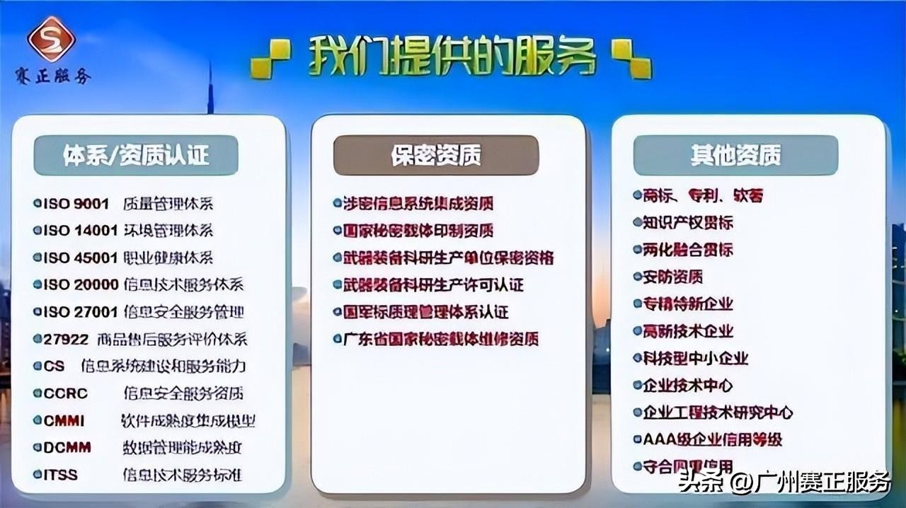 广州市赛正信息技术服务有限公司,提供专业的涉密信息系统集成资质、涉密印刷资质、军工保密资格、ISO体系认证、信息安全等认证咨询,免费评估条件,定制方案,流程简单,减少企业负担,让您更省心!