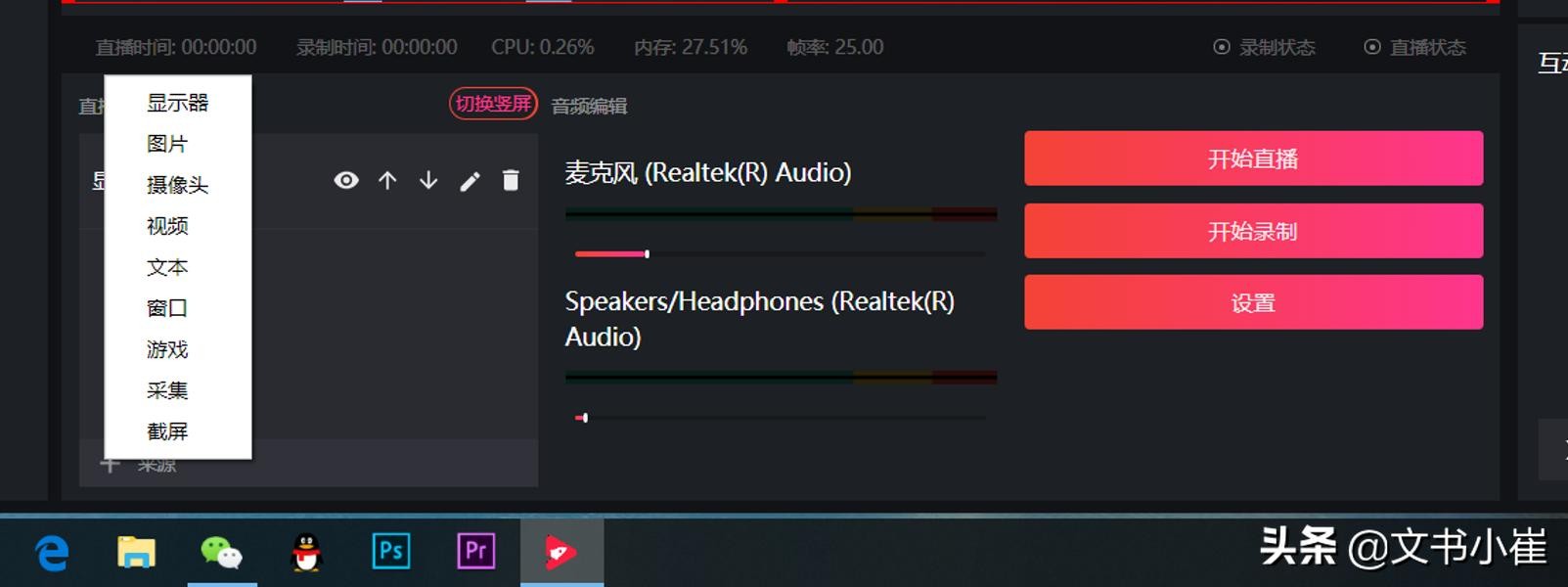 显示器、图片、摄像头、视频、截屏等都可以加入到直播内容中。