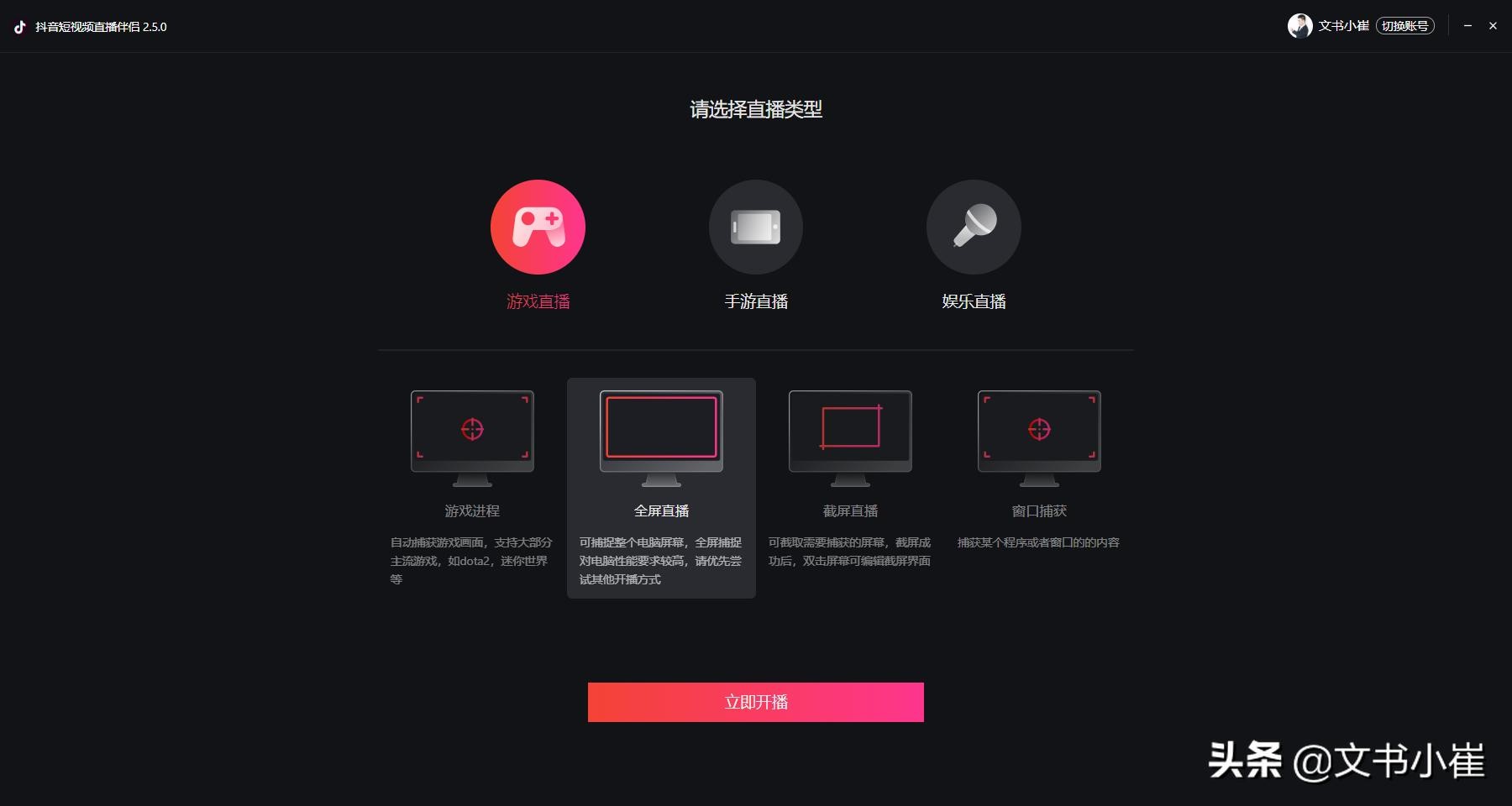 直播讲课,建议直播类型选择游戏直播中的全屏直播。