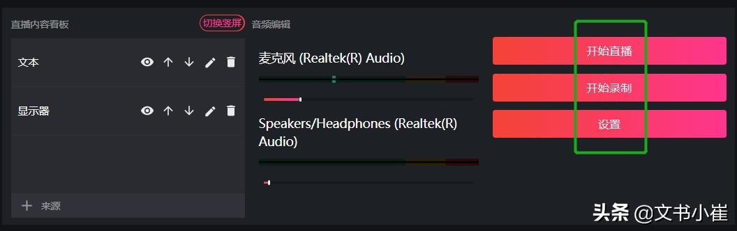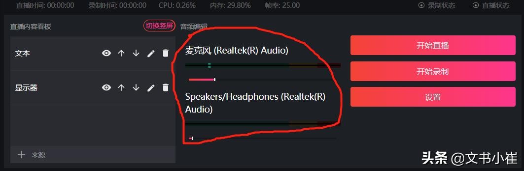 如果要在直播过程中播放音频,比如英语听力内容,可以把系统音量调大,也就是“麦克风”下面那串英文代表的系统声音,不同的电脑会显示不同的内容,意思就是系统声音。