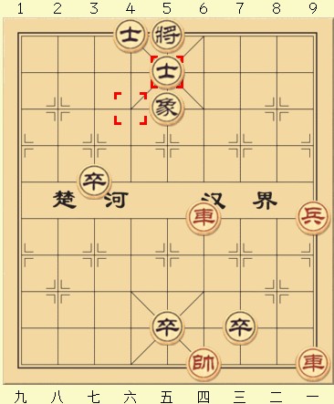 可以看到若红方在黑象前进后仍然选择按兵不动,那黑方就赢了,由于黑象出其不意地阻挡到了红车的绝杀路线,所以黑方以一步的优势获胜。所以到这种局面红方只有一种走法——进兵。首先兵五进一,此时黑方即使再平卒也已经跟不上了,所以只能进士吃兵。而红车不能离开纵四,所以红方也只能进车吃士,这时若黑方起士,那这盘棋就变成了和局,此时无论红方怎么将也将不死黑方。