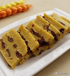 黄米切糕,即粘糕。蒸好的年糕是个“坨”,零售或食用时须一片一片地切下来,所以称“切糕”。赤峰南部较干旱,生产的黄米粘性大,做出的粘糕粘而不沾,“筋道”而不“懈胎”。蒸出的粘糕色泽金黄,配之以红芸豆和大红枣,色、香、味俱佳。