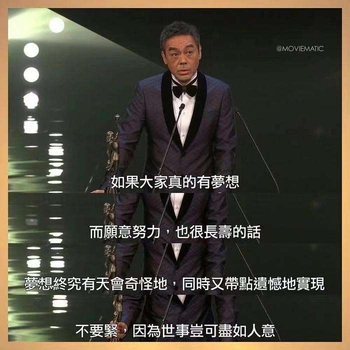 今年在金像奖上三封影帝的刘青云,也鼓励大家只要有梦想就去努力吧,虽然过程可能并不完美,但交给时间,梦想终究会奇怪地又带点遗憾的实现。