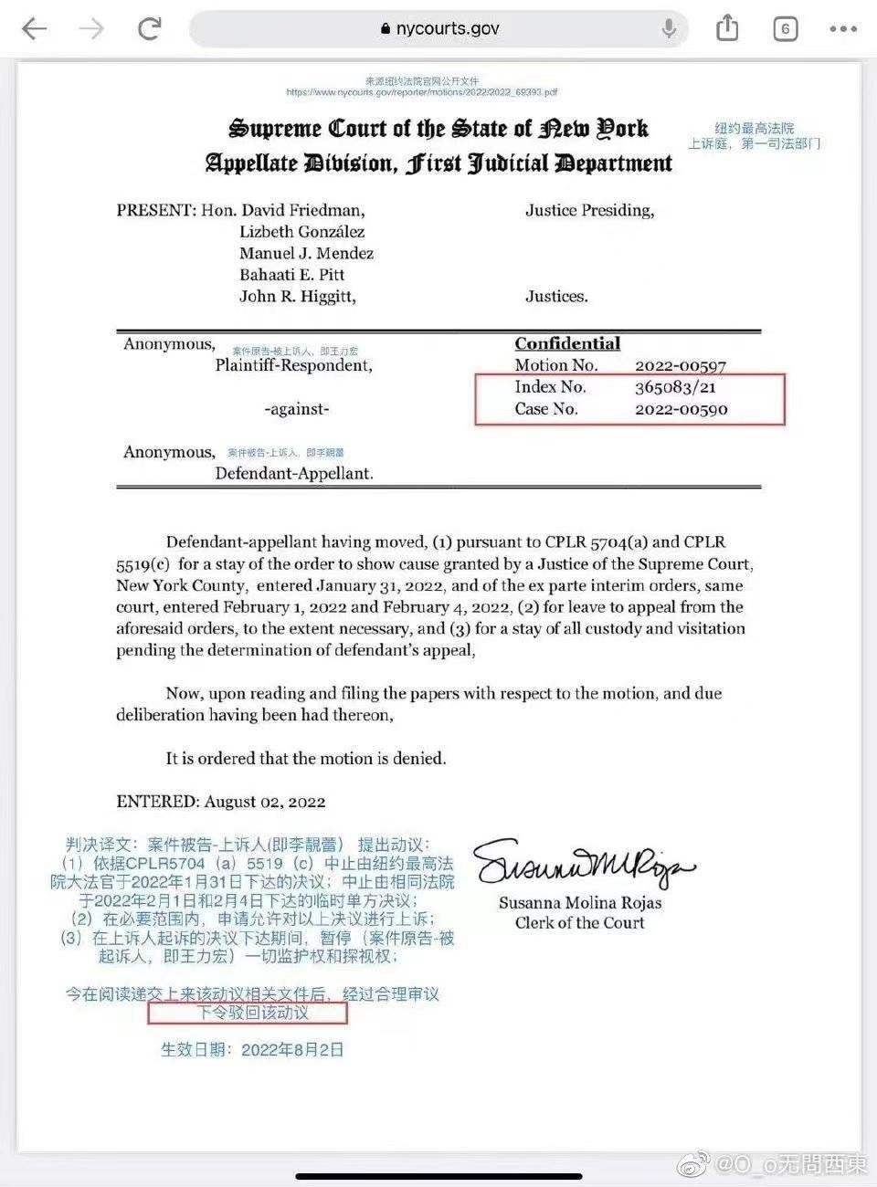 继而有网友扒出:根据美国法院公示: 美国法院判给王力宏的正当探视权和抚养权的判决,李靓蕾发起上诉,经上诉庭审议,被纽约法庭驳回,且根据美国法院规定一旦上诉被驳回不得再上诉,从而佐证李靓蕾的律师再撒谎,她在纽约法庭从来没有胜诉。
