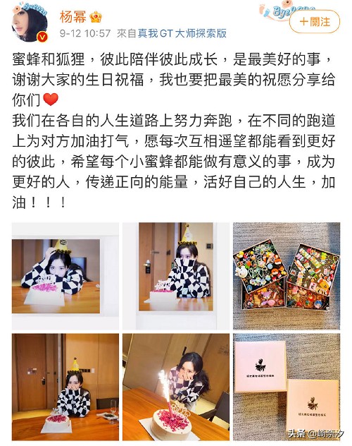 9月12日是杨幂的生日,杨幂发微博称,“愿每次互相遥望,都能看到更好的彼此”。