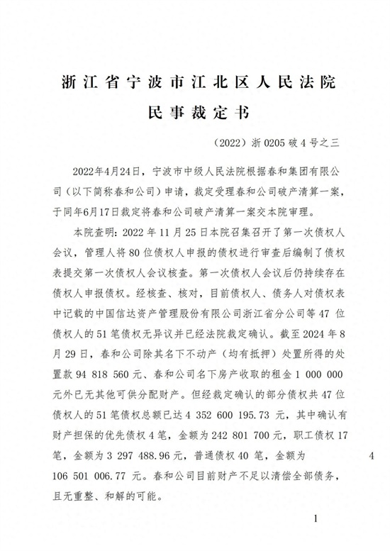 浙江省宁波市江北区人民法院:2022年4月24日,宁波市中级人民法院根据春和集团有限公司(以下简称春和公司)申请,裁定受理春和公司破产清算一案,于同年6月17日裁定将春和公司破产清算一案交本院审理。