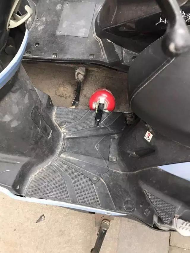 掉落的灭火器将楼下一辆电动车踏板附近砸烂。