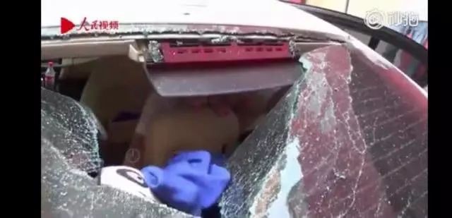 车后挡风玻璃被砸出了一个大窟窿。
