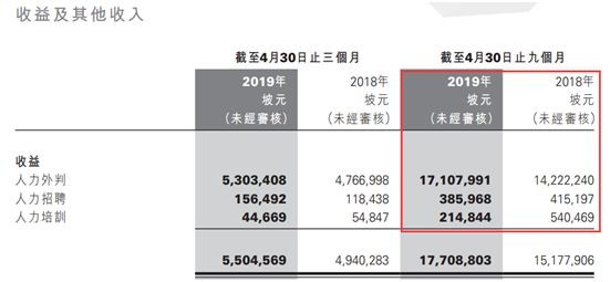 数据显示,人力外判业务截至2019年4月30日9个月的收益为1710.80万新加坡元,较去年同期增加20.29%;而人力招聘、人力培训截至2019年4月30日9个月的收益分别为38.60万新加坡元和21.48万新加坡元,分别同比下滑7.03%和60.25%。