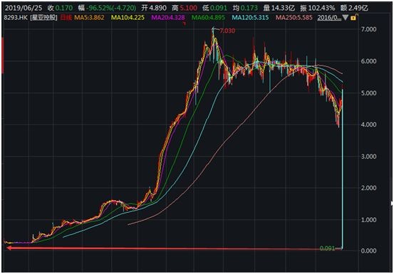 截至收盘,星亚控股报0.172港元,跌幅达96.48%,总市值一日蒸发约58.98亿元,仅跌剩2.15亿港元,全日成交额3.06亿港元。