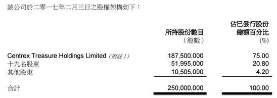 公告称,截至2017年2月3日,有19名股东合共持有5199.5万股,相当于该公司已发行股本之20.8%。有关股权连同由该公司一名控股股东所持有之1.875亿股,相当于该公司已发行股份总额之95.8%。因此,该公司只有1050.5万股由其他投资者持有,占已发行股份4.2%。