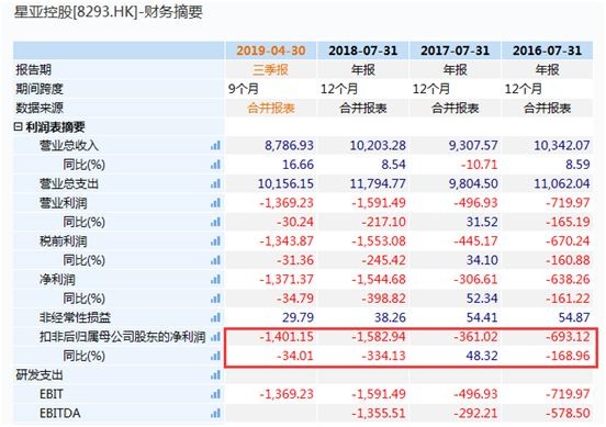公司历年财报显示,星亚控股自2016年上市以来,便开始亏损,至今仍未有一个年度财报实现正收益,且亏损还在扩大。