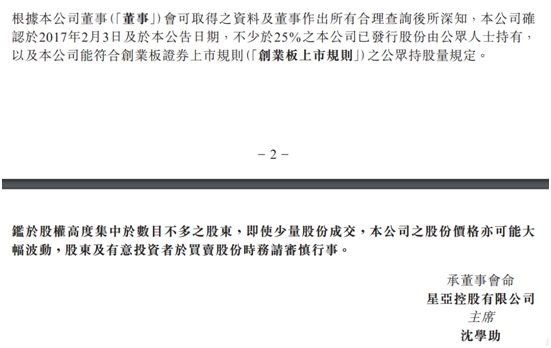 对此,公司回复称,公司确认于2017年2月3日,不少于25%的已发行股份由公众人士持有,公司符合香港创业板证券上市规则有关公众持股量的相关规定。鉴于股权高度集中在数目不多的股东手里,即使少量股份成交,公司的股价有可能大幅波动,股东和有意投资者在买卖公司股票时请谨慎。