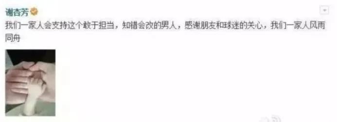 “我们一家人会支持这个敢于担当、知错就改的好男人,感谢朋友和球迷的关心,我们一家人风雨同舟。”