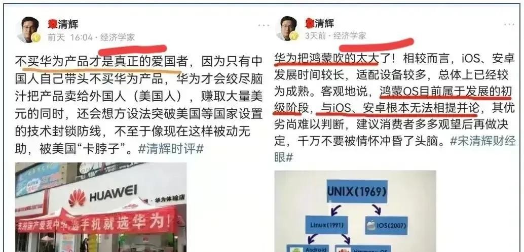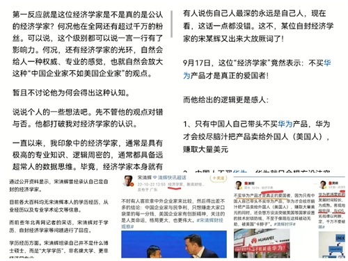 只是感慨,就个人印象,最近几年,关于对华为的看法,类似“宋清辉式”表达,有不少。比如一些网友就说过类似的话:“一家没有什么核心竞争力的企业,只能靠爱国流量活着”