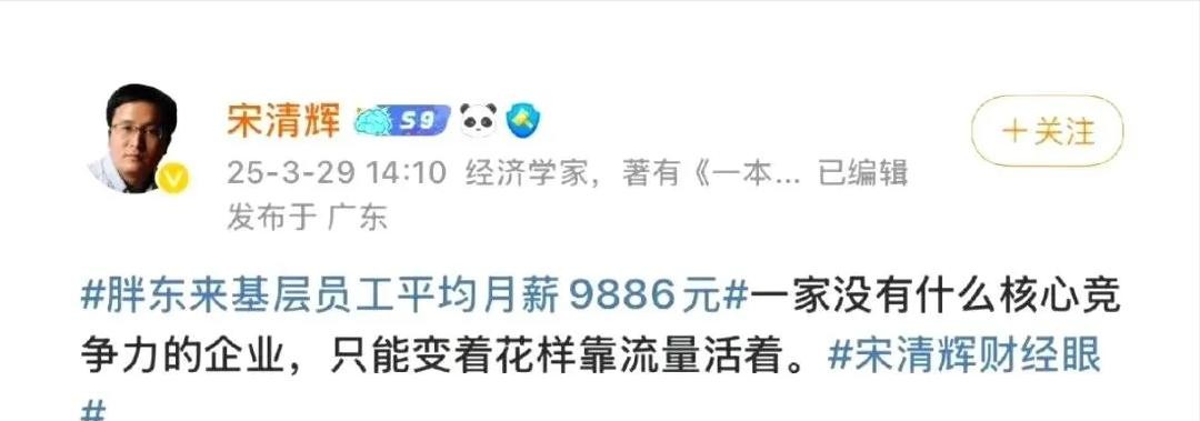 据悉,3月29日,“胖东来基层员工平均月薪9886元”这个话题迅速冲上热搜,引发广泛热议,而经济学家宋清辉就此评论称:一家没有什么核心竞争力的企业,只能变着花样靠流量活着。