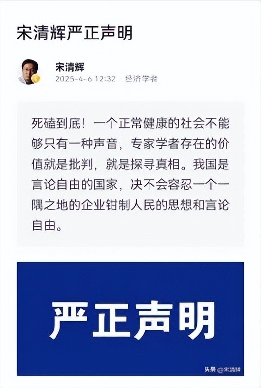 与此同时,宋清辉本人迅速在网上发表声明:死磕到底!