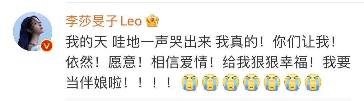 李莎旻子说:“我的天,哇地一声哭出来,我真的!你们让我!依然!愿意!相信爱情!给我狠狠幸福!我要当伴娘啦!”
