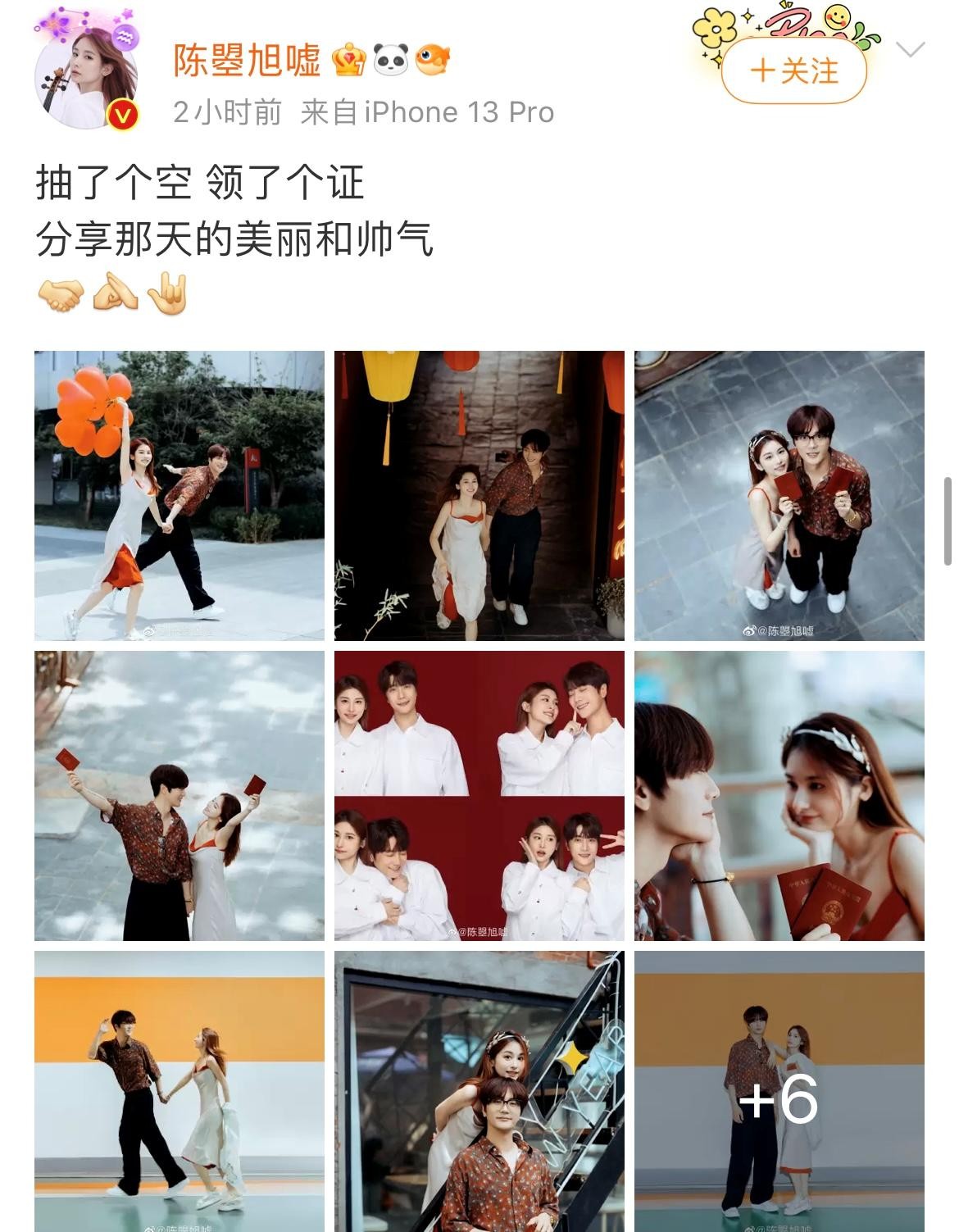 陈曌旭则表示:“抽了个空,领了个证,分享那天的美丽和帅气”。