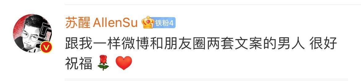 苏醒说:“跟我一样微博和朋友圈两套文案的男人很好,祝福”。