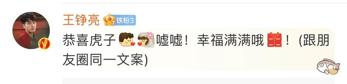王铮亮说:“恭喜虎子嘘嘘!幸福满满哦!”