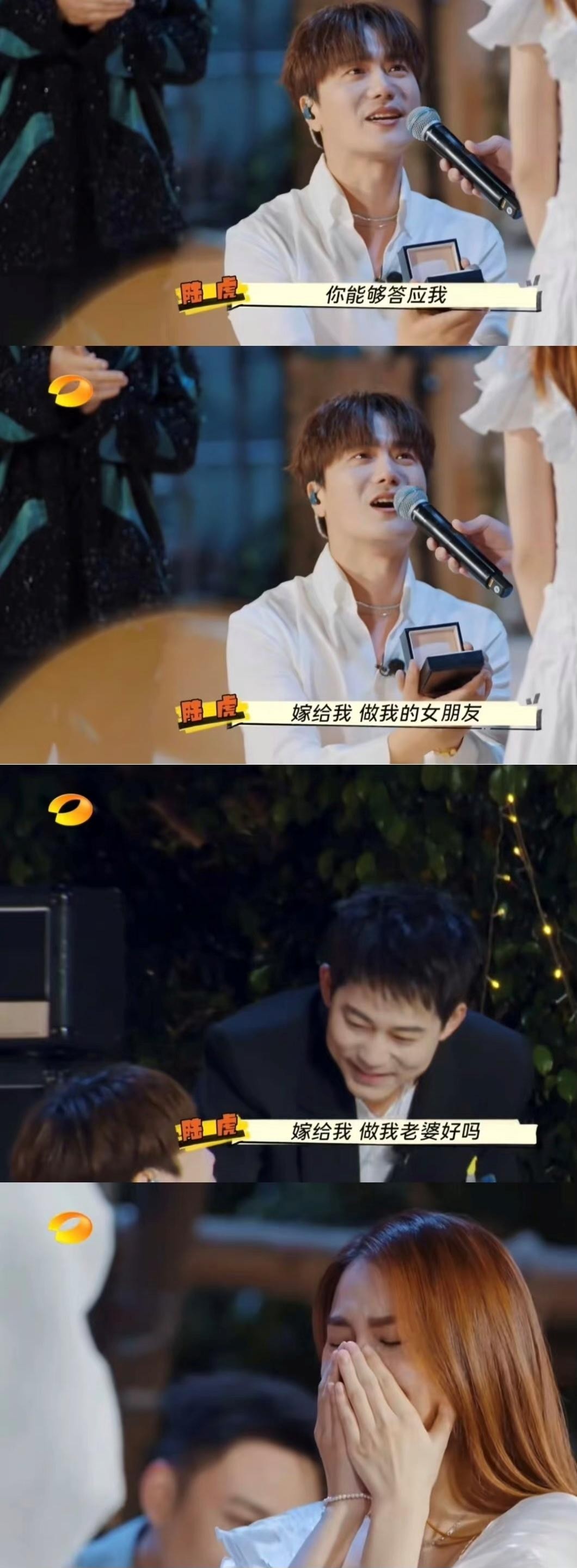 终于,在今年3月2日《快乐再出发第二季》收官演唱会上,陆虎精心准备了一场求婚,唱着歌曲《表白白》的他拿出戒指,单膝下跪向陈曌旭求婚成功。