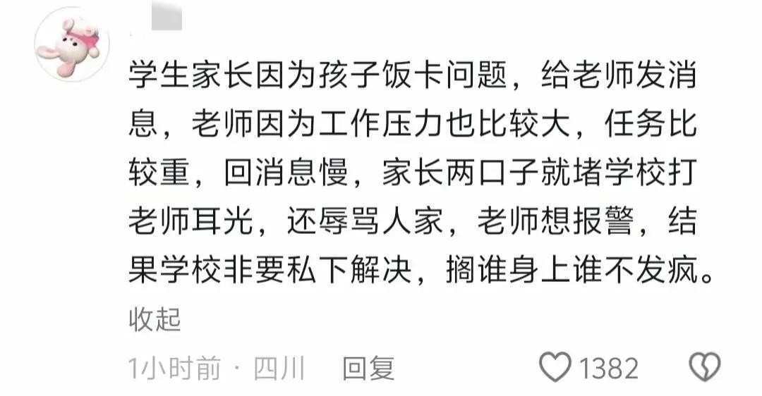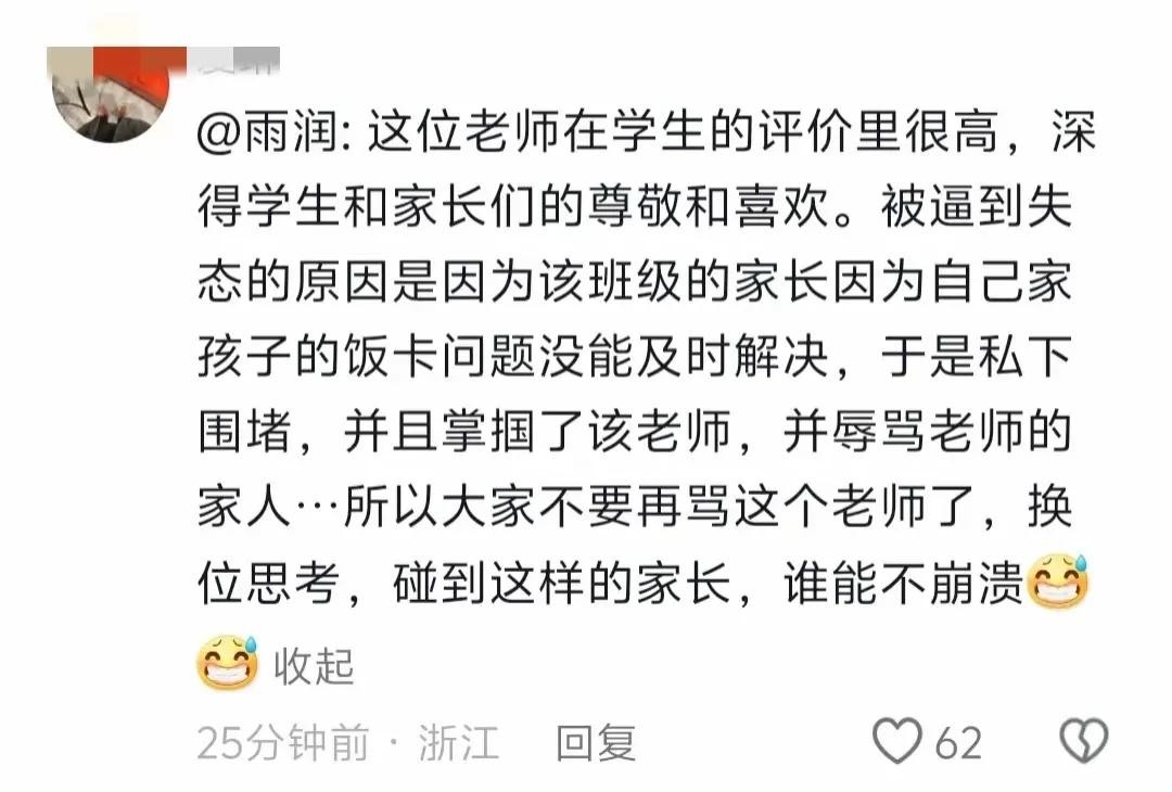 事件发展到这里,大家也比较理解这位老师,认为家长有错,学校也不作为,看了着实让人生气。
