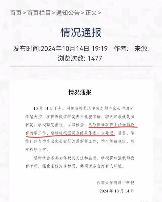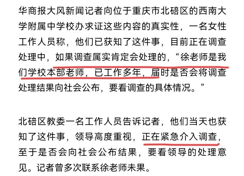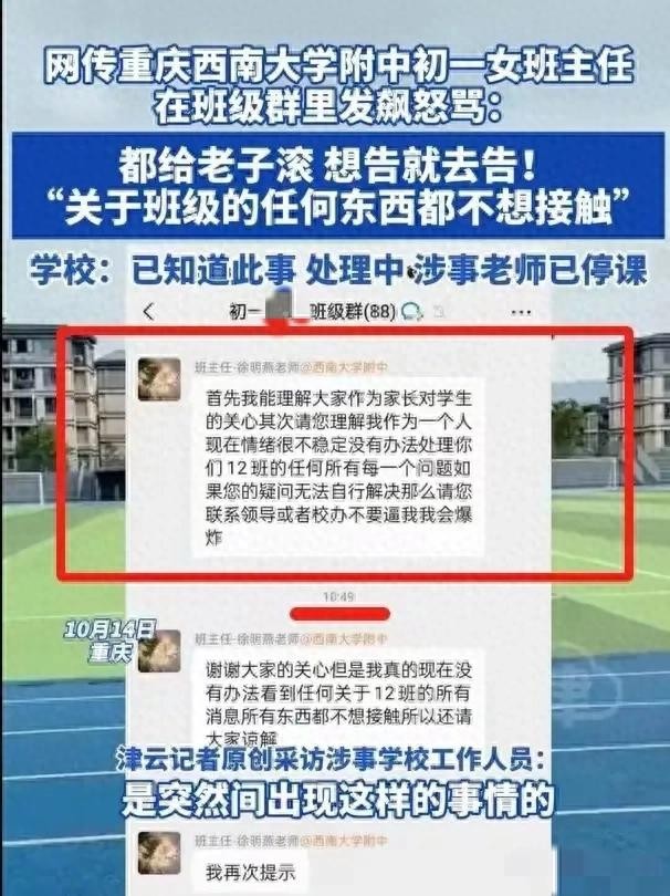 这位家长说,班主任老师姓徐,是西南大学附属中学的初一某班的班主任。