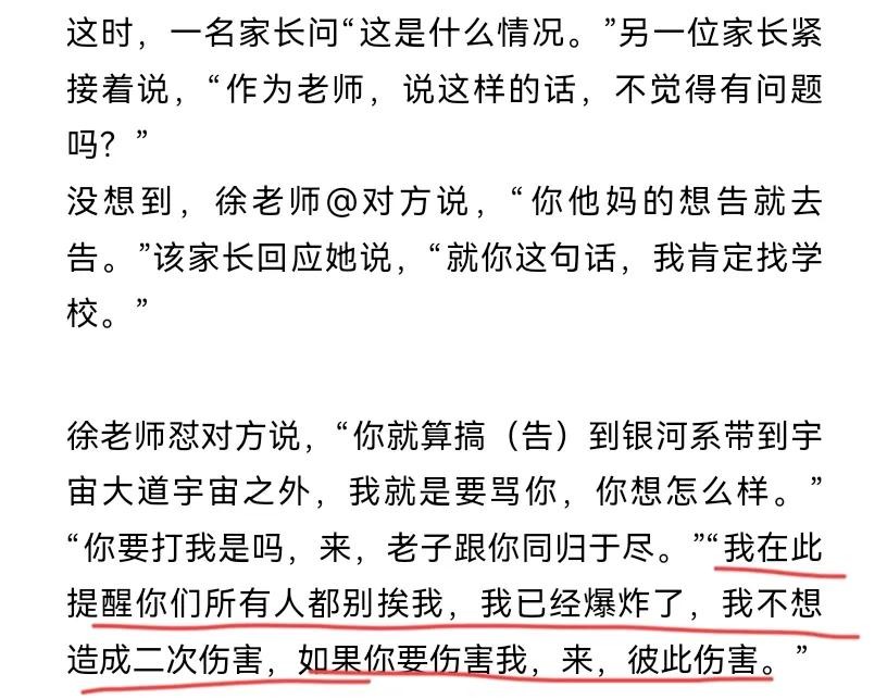没想到徐老师也非常硬气,我要跟你同归于尽,我已经炸裂了,提醒大家不要对我二次伤害,否则后果自负。