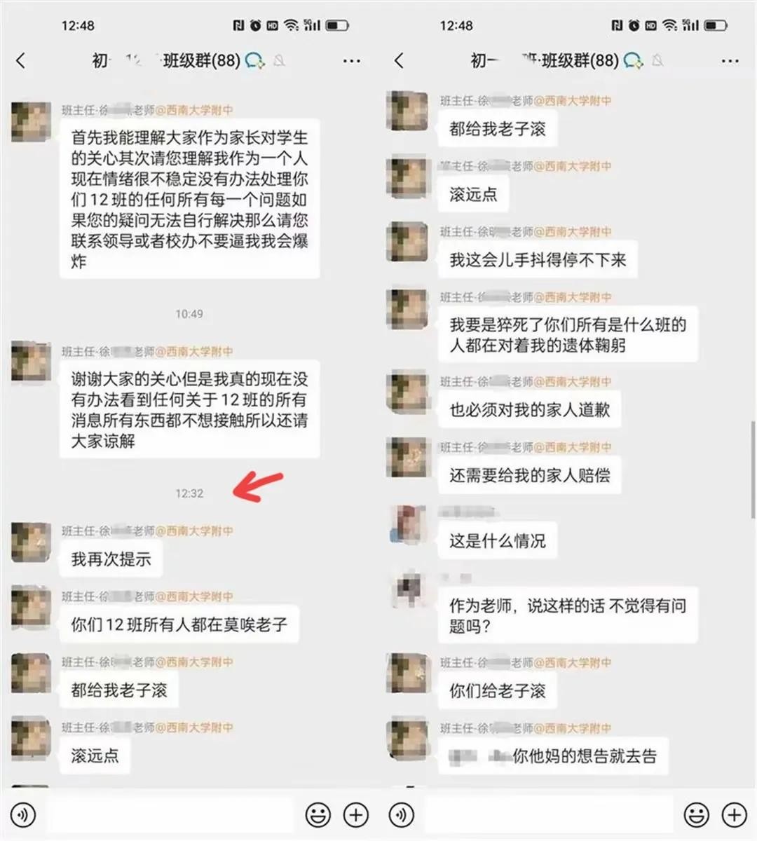 随后当天中午的12:32分,徐老师又说了过激的话语。