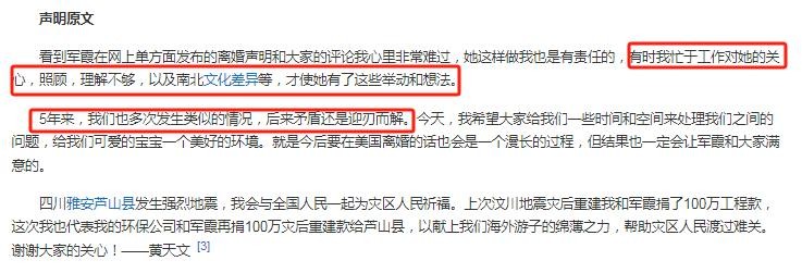 而黄天文发布的长文中,也明确表示两人并无不轨行为,只是本身的文化差异和性格问题导致的分离,自己也没能照顾好妻子。