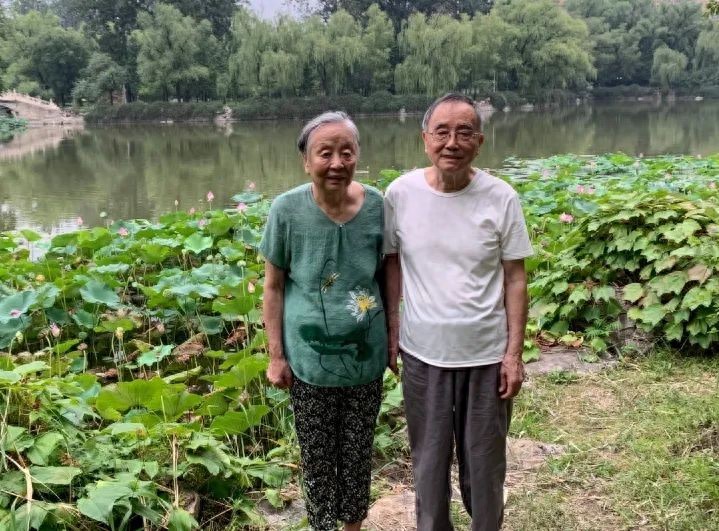 一组照片中可以看到,吴叔叔和朱阿姨气色都不错,二人并肩立于荷花塘畔, 温文儒雅, 面带微笑。