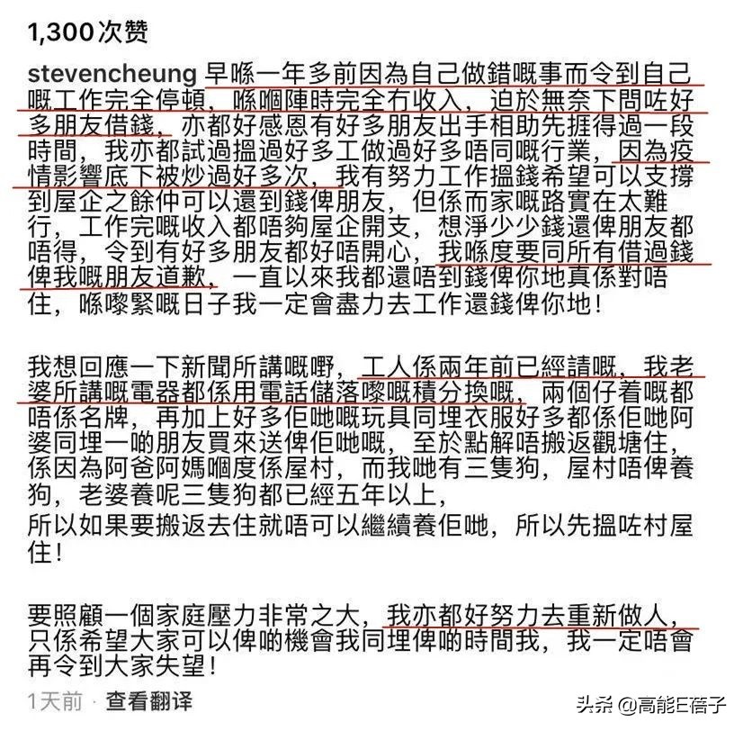 在一片争议声中,张致恒终于发声回应。他表示自己因为做错事工作全停了,完全没有收入,被迫向好友借了钱。他有反省好好工作,并试过很多不同的工种,只是因为疫情多次被炒。
