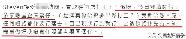事后,他接受港媒采访,承认了在酒店打工一事,称自己不知道未来的路如何,但会尽量做好自己的责任,照顾老婆和孩子。而且他认为做散工也学到好多东西,虽然辛苦,但没钱更辛苦。