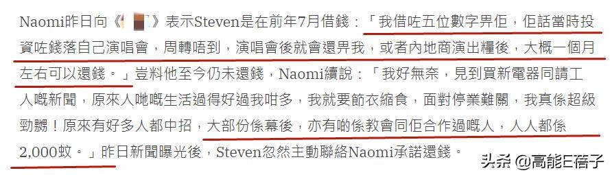 Naomi接受港媒采访时还透露,张致恒是前年7月借的钱,承诺一个月左右还,结果至今仍没有还钱。