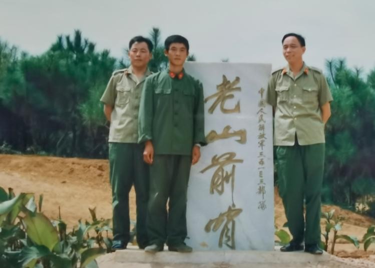 老山轮战结束后,向小平与战友在“老山前哨”纪念碑前留影