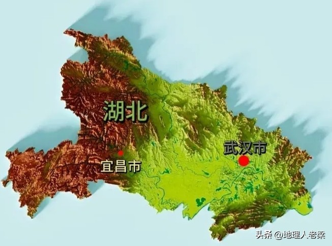 湖北省地形图。地势大致为东、西、北三面环山,中间低平,略呈向南敞开的不完整盆地