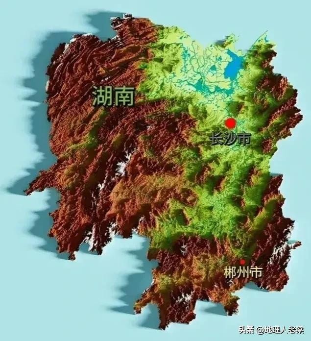 湖南省地形图。湖南省呈三面环山、朝北开口的马蹄形地貌,地跨长江、珠江两大水系