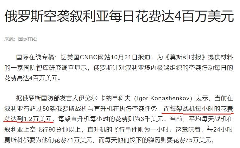2015年10月22日,国际在线,《俄罗斯空袭叙利亚每日花费达4百万美元》