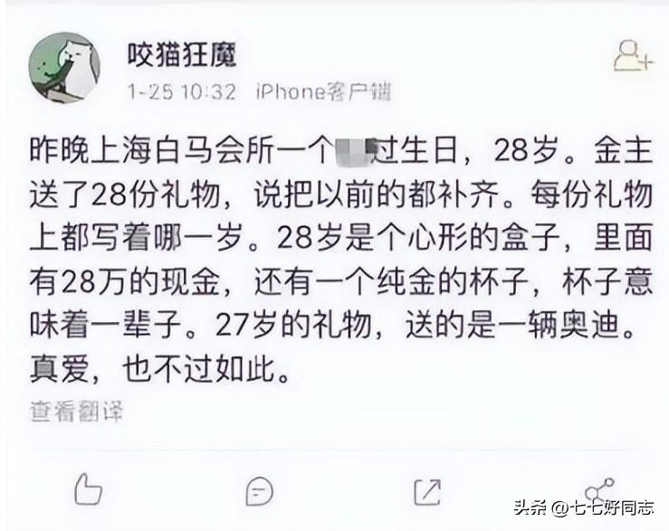 2019年1月25日,一个大雪纷飞的普通冬日,在一座位于上海市中心的高级会所里,一群俊男靓女缠绕在一起,尽情的欢舞着、嬉闹着。这是一座斥资400万元的顶奢会所,内部装潢富丽豪华,极尽奢靡。它如同一座神秘莫测的城堡,矗立在上海最繁华的中心地段。此刻,这里正举办一场私人生日派对。派对的主人翁是这家会所的“头牌”,今天是他28岁的生日。为博他欢心,富婆金主不仅豪掷千金包下整个会场为他庆生,更准备了28份价值不菲的高档生日礼物。这28份礼物中绝大部分是Prada、纪梵希等一线高端奢侈品,还有几只价值数十万的男士手表,所有礼物加起来价格接近两百万元!