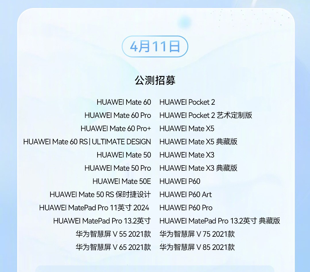 除了硬件之外,对于华为Pura 70 系列预装的鸿蒙OS 4.2,前不久官方公布了覆盖180 余款设备的升级计划,首批支持机型包括华为 Mate 60 系列、Mate 50 系列和 P60 系列等设备,而且现已开启升级,完整机型名单如下: