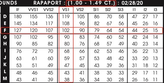 首先,参照国际钻石报价单找出1.3克拉钻石所在的重量范围表格,然后依照钻石颜色F色和净度VS1,再根据表格找到相对应的报价单价格为102。