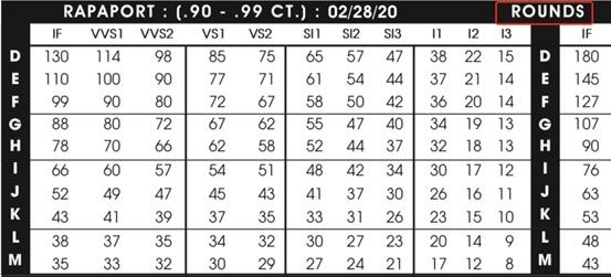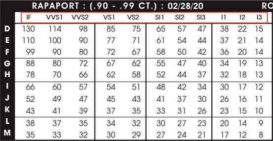 1. 在报价单上是以重量先分类,如Rapaport ( 0.01 - 0.03 CT ) ,这一区块只有包含0.01ct 至 0.03ct重量的钻石报价,而表格的左边由上往下是钻石颜色等级,上面由左至右是钻石净度等级,唯有钻石车工等级没有在 Rapaport Diamond Report上, 但它是取中等车工等级为基准,极优的钻石车工则价格比参考价要高的多,反之车工极差当然价格比参考价低很多。