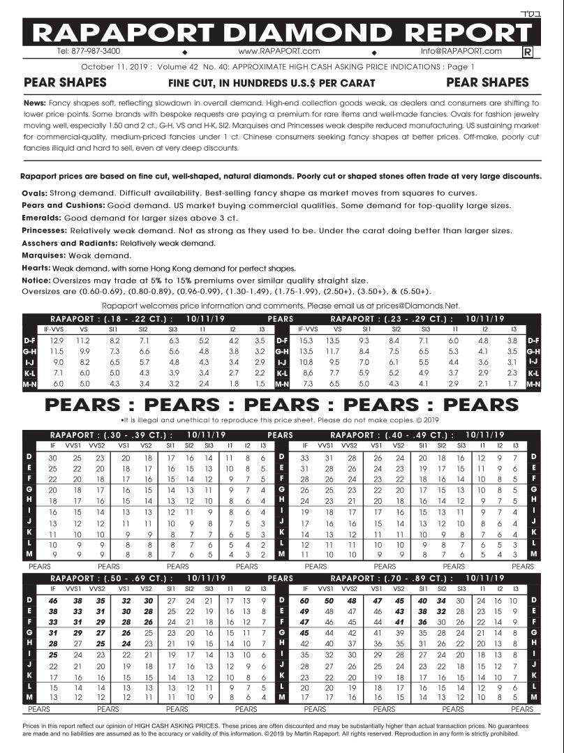 3. 需注意不同钻石外型,则报价也不同,国际钻石报价单(Rapaport Diamond Report)都会在上面标明适用于何种形状的钻石。关于车工等级的差别或重量的影响,可留意表格间的附注事项。