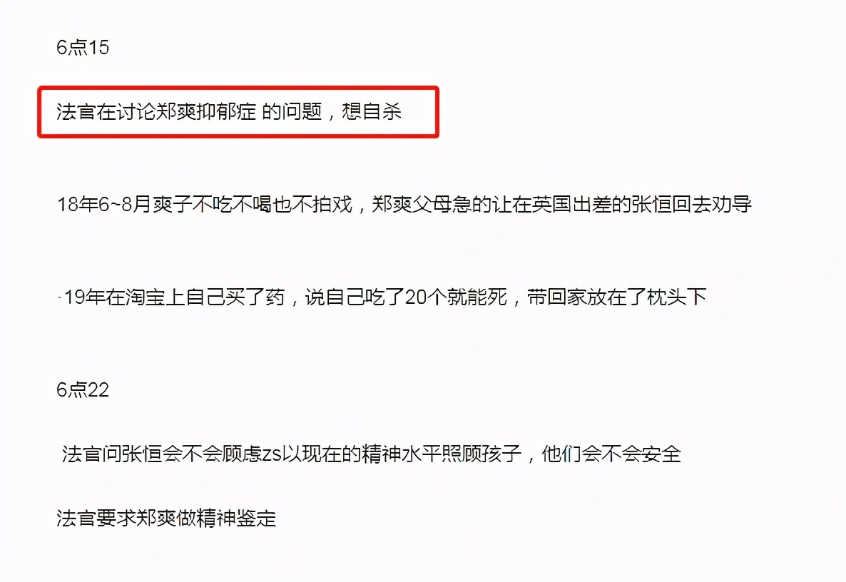 2018年6月到8月期间,郑爽不吃不喝也不拍戏,郑爽父母急得让在英国出差的张恒回去劝导。2019年,郑爽在购物平台买了自杀药物,说自己吃20个就可以死,买之后就一直放在枕头底下。之后,法官问张恒会不会顾虑郑爽的精神水平照顾孩子,担心人身安全,并且要求郑爽做精神鉴定。
