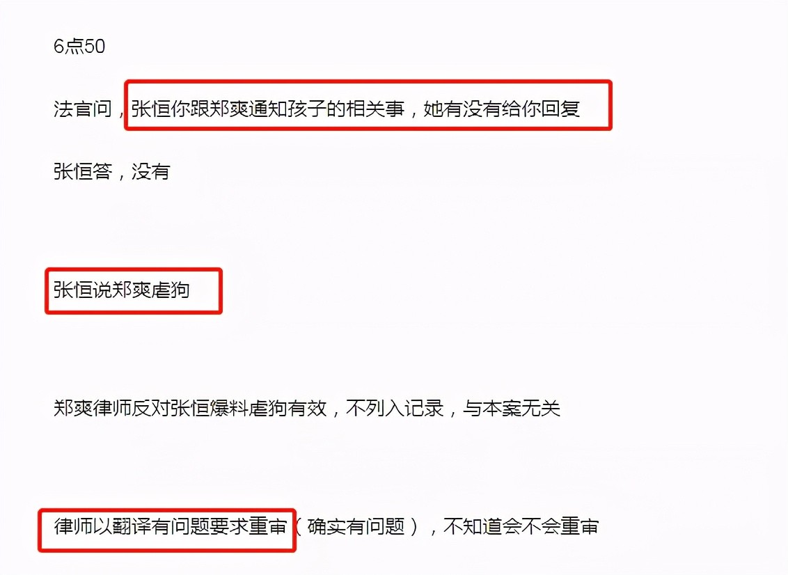 法官问张恒郑爽是否有回复关于孩子的相关事宜,张恒称没有。另外,对于张恒说郑爽有虐狗,郑爽律师反对张恒爆料有效,并声称与本案无关。最后,律师以翻译问题要求重审。