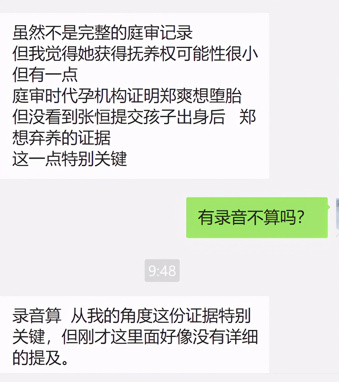 可以说,张恒在庭审中的表现非常积极,尤其是争夺抚养权的相关内容,有细节。而郑爽的表述就无厘头,发言就极其不稳定,前后不一。随后本号咨询了律师,按照目前的庭审表现,郑爽获得抚养权的可能性再次降低。不过也直言需要张恒提供郑爽想弃养证据,这一点很关键。
