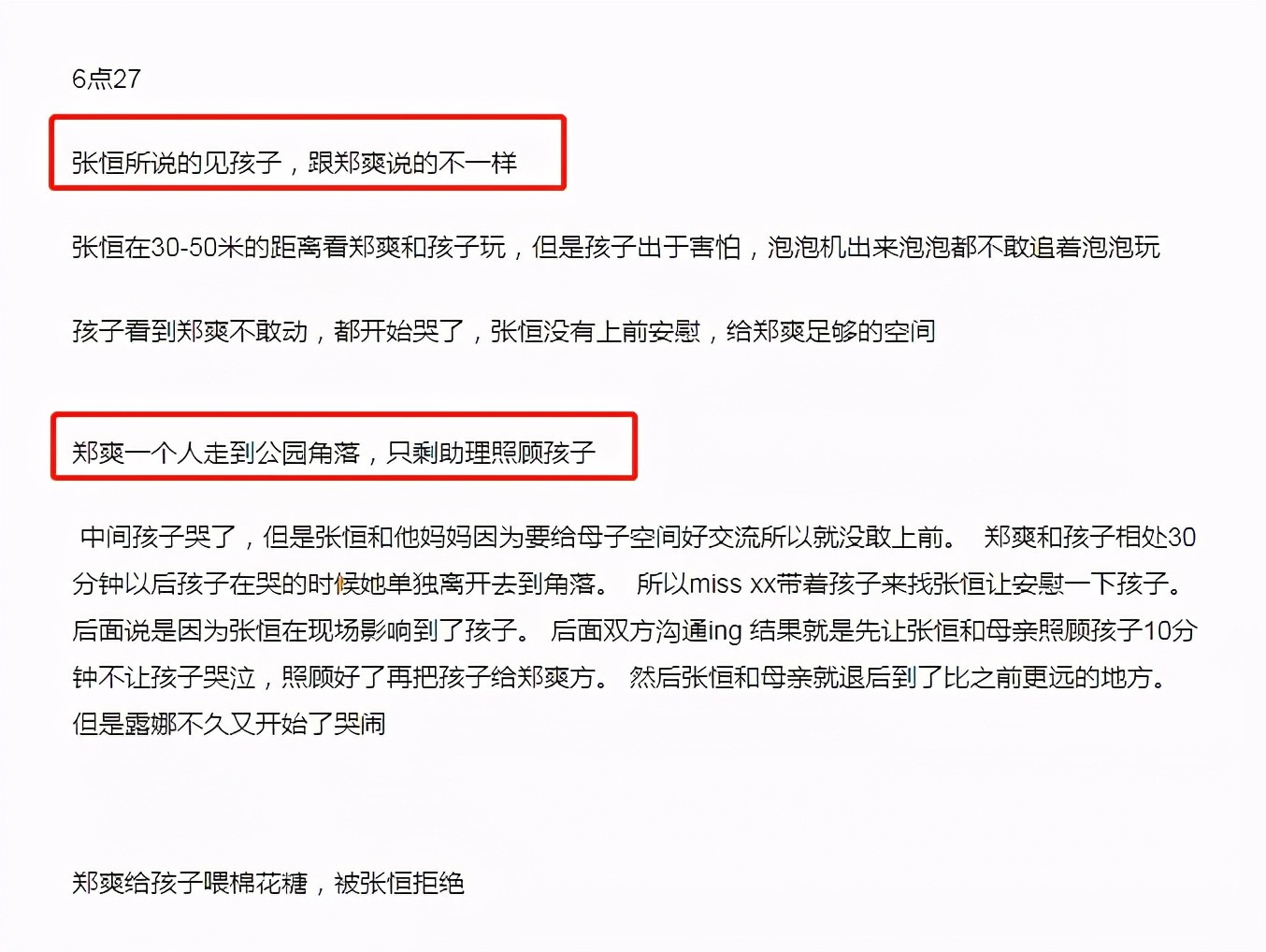 张恒说郑爽见孩子的场景与郑爽表达不一致,张恒说自己在三十到五十米之间的距离看到 郑爽与孩子玩耍,但是孩子出于害怕看到郑爽不敢动,泡泡机出泡泡都不敢追着玩,张恒和妈妈看到后想着要给母子空间就不敢上前,最后看到孩子哭了才上前安抚。大约在郑爽和孩子相处三十分钟后,郑爽一个人走到角落,留下助理照顾孩子。所以跟郑爽描述的张恒影响到孩子不一样。张恒还制止了郑爽要给孩子喂棉花糖。