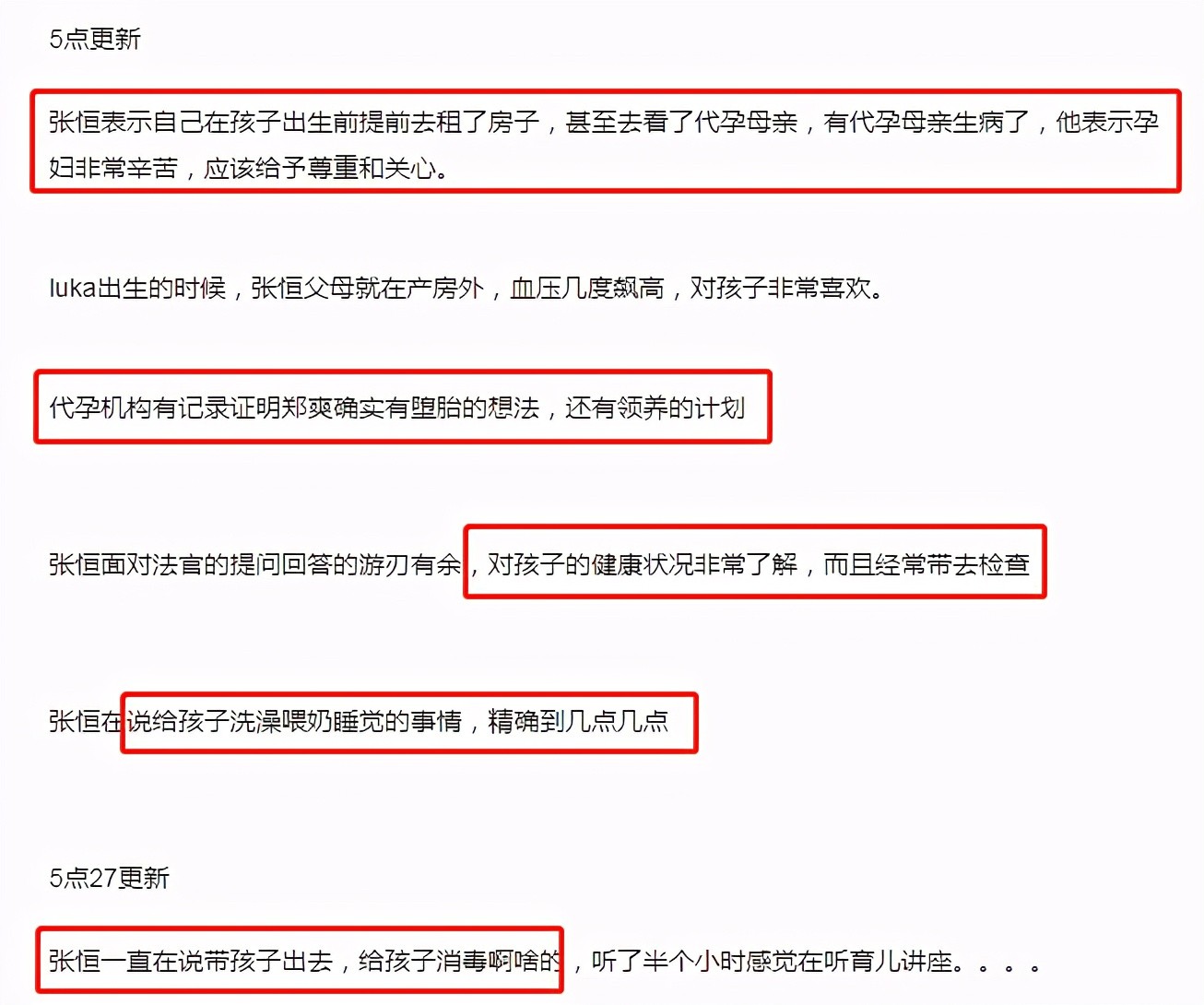 张恒表示自己在孩子出生之前就提前租赁了房子,看了代孕母亲,代孕母亲非常辛苦。孩子出生的时候,张恒父母在产房外等待,血压几次飙升,对孩子很喜欢。代孕机构证明郑爽有堕胎的想法和领养计划,对法官的提问都回答得很详实,细到孩子的洗澡、喂奶、睡觉等问题,可以精确到几点,还十分了解孩子健康情况,经常带去检查身体。庭审期间,还一直让给孩子带出去消毒。