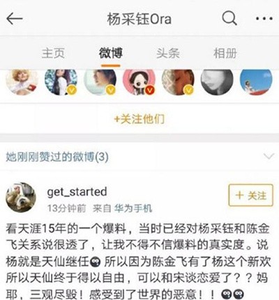 究竟是怎么回事呢?原来前几日,在《芳华》中饰演“林丁丁”的杨采钰在微博点赞了一条关于“刘亦菲与其干爹陈金飞三观尽毁的黑料”。爆料中称,因陈金飞有了杨采钰这个新欢,才让刘亦菲终于有了自由。